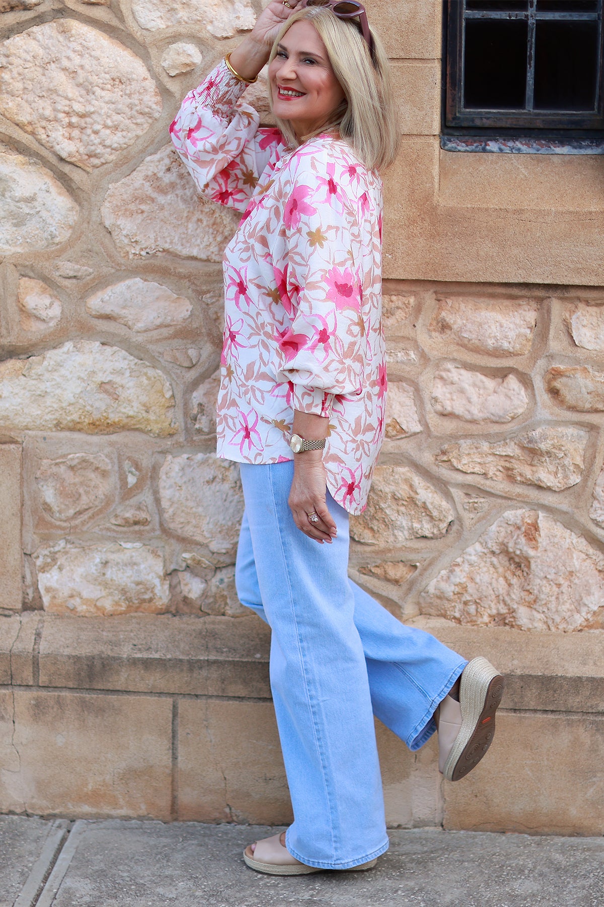 With its calming neutral base and statement floral print, this blouse brings timeless feminine style to your wardrobe while offering the comfort and practicality you’ll love wearing every day.