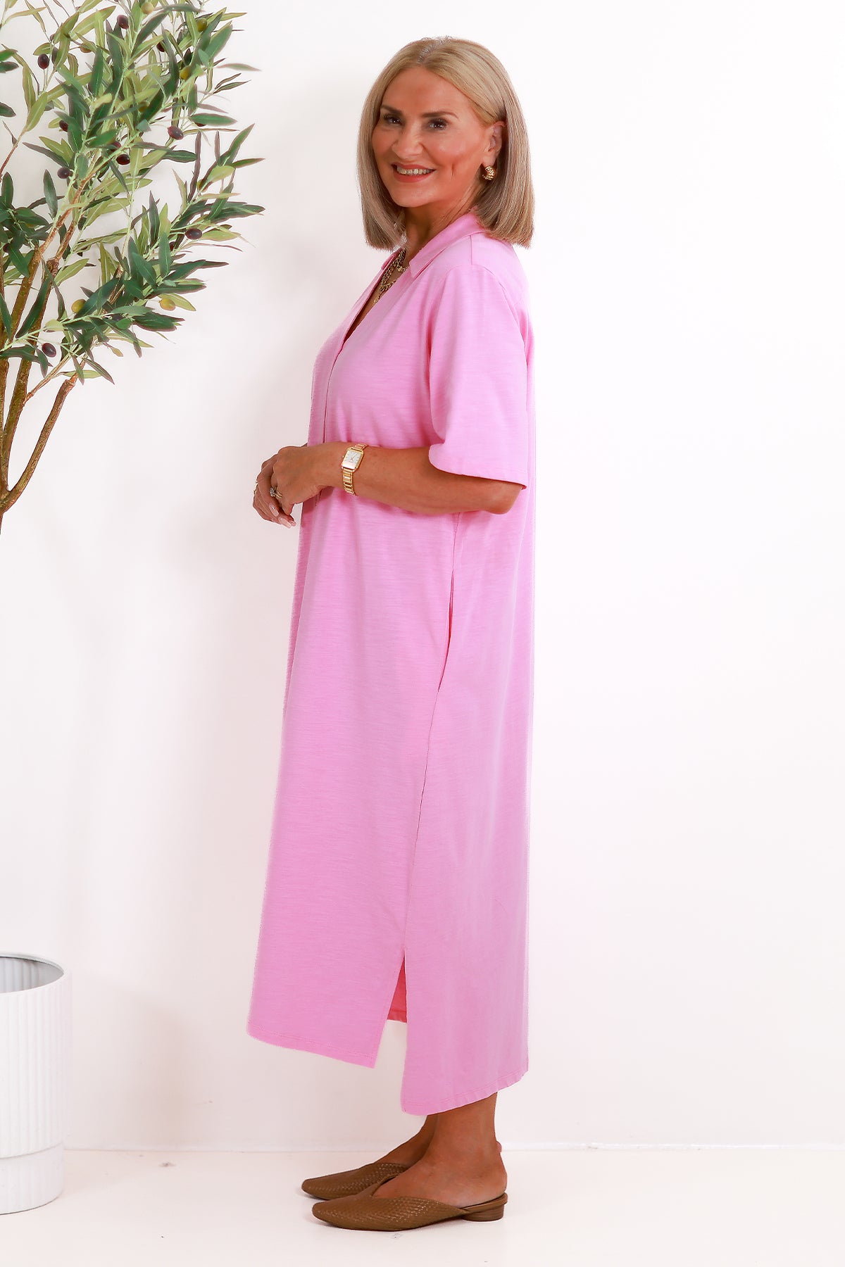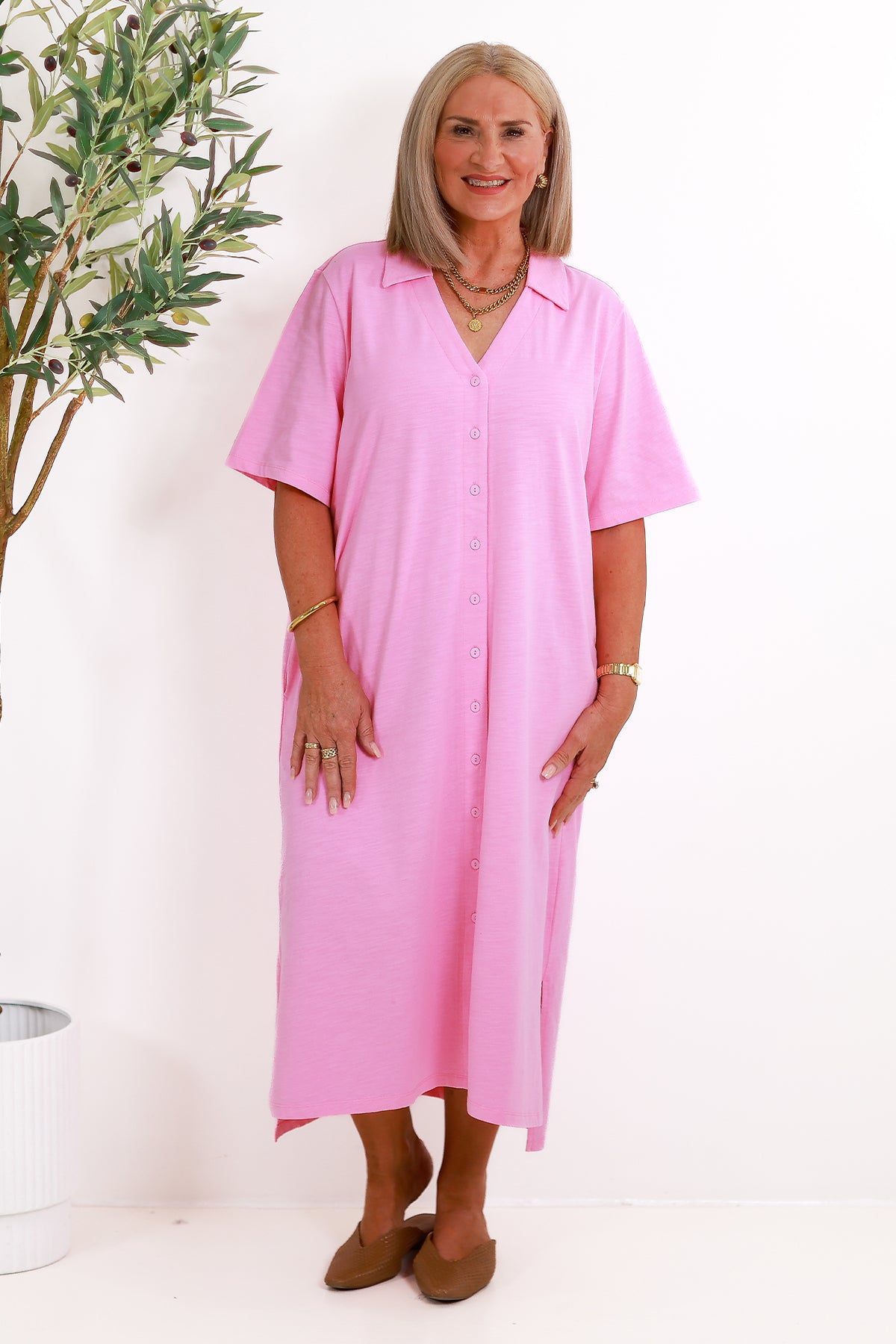 Made from premium grade cotton, our slouchy tee dress, gives a relaxed fit, that keeps you cool  and comfy. We love the flattering V Neck, and smart collar that adds style and sophistication.