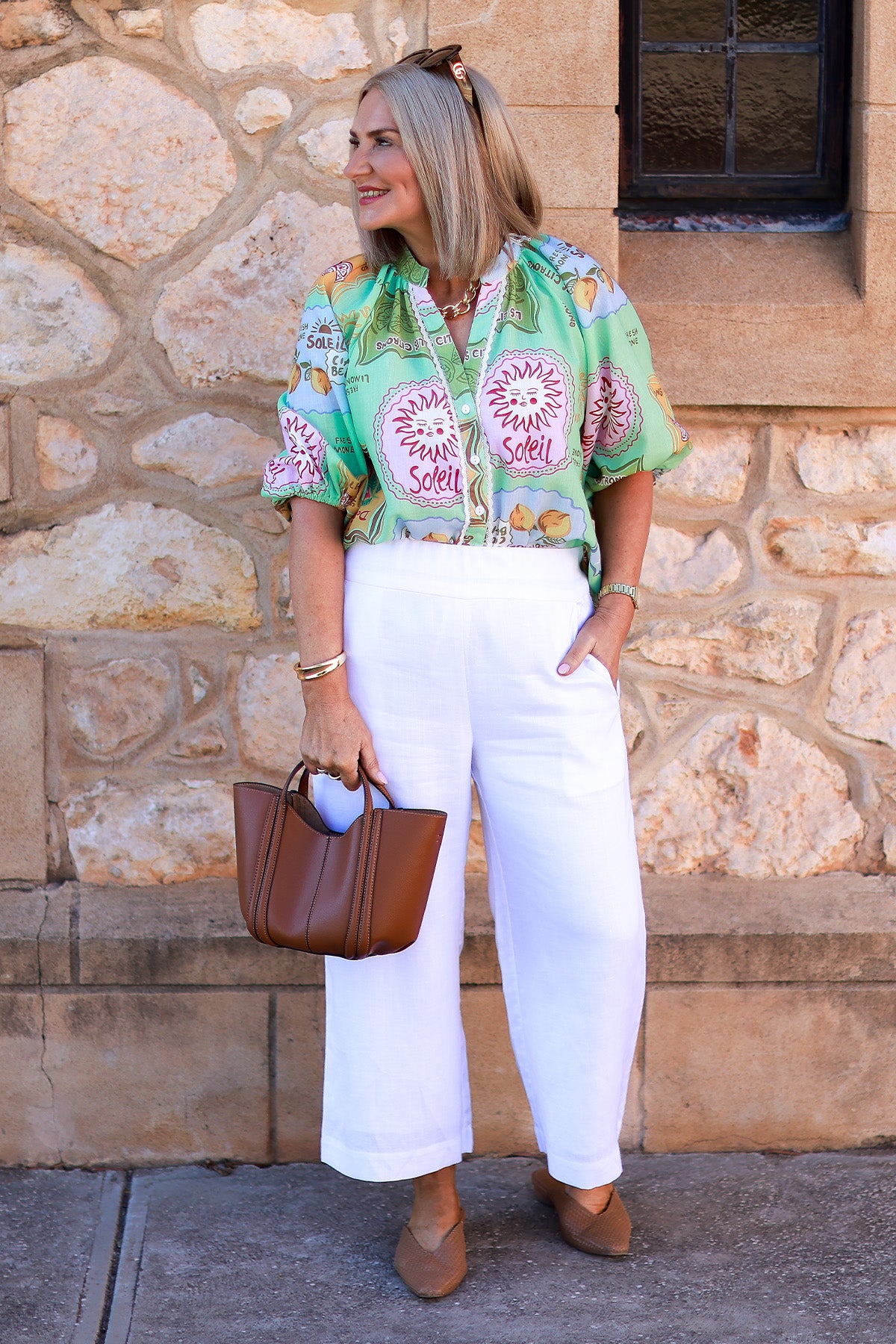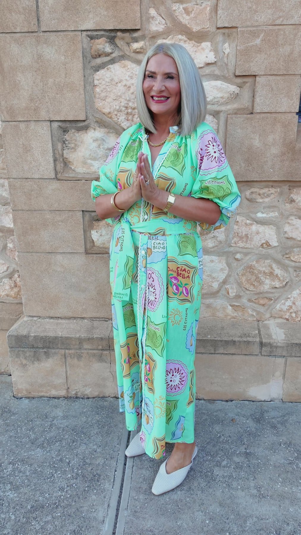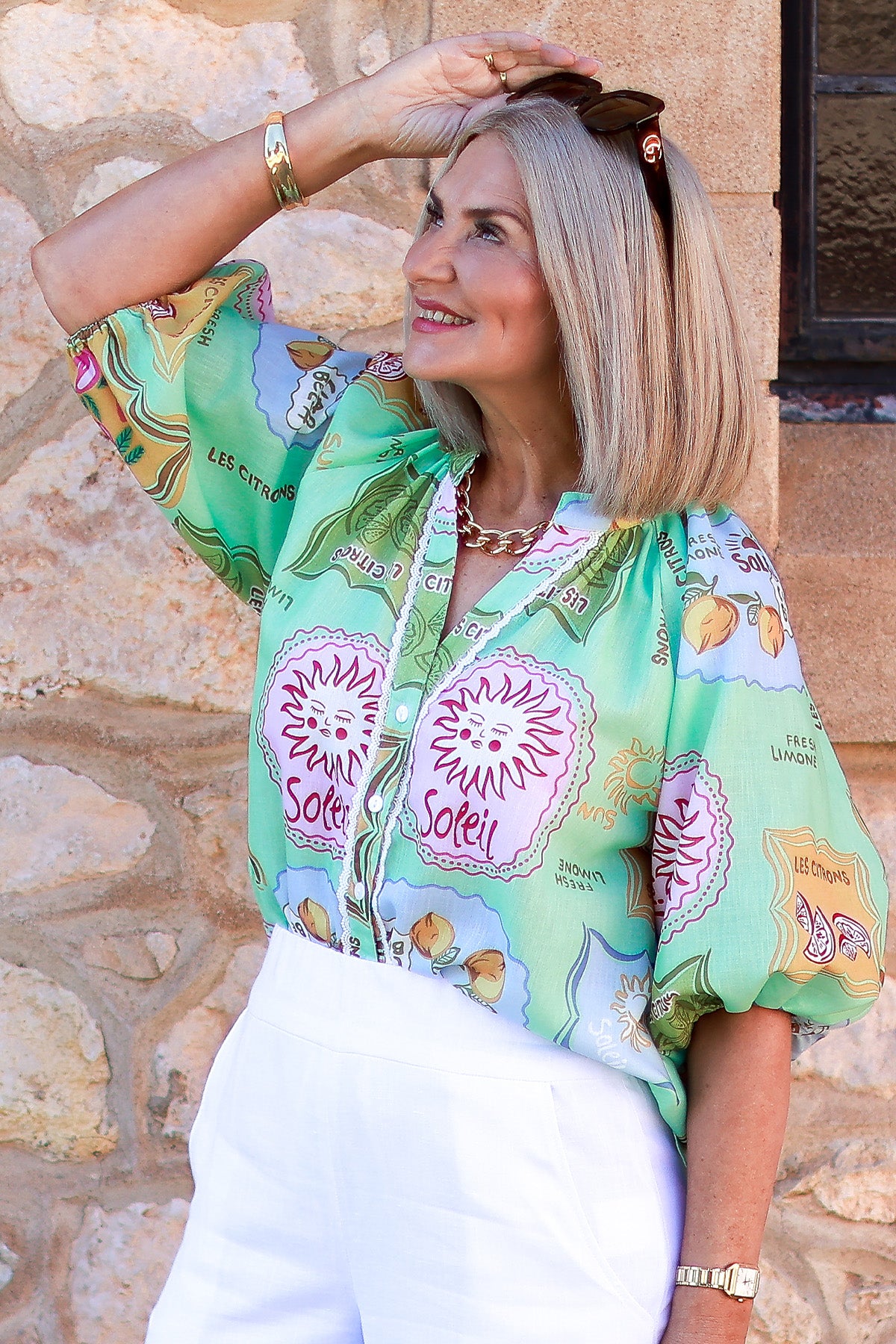 Bright, playful, and effortlessly airy, this shirt is crafted from lightweight fabric and features a cheerful Lime base adorned with sun motifs, citrus illustrations and whimsical label style graphics.