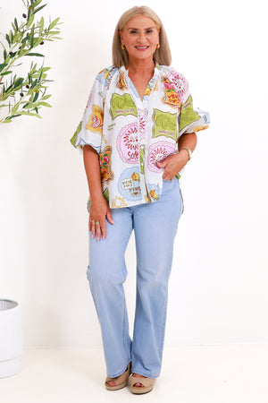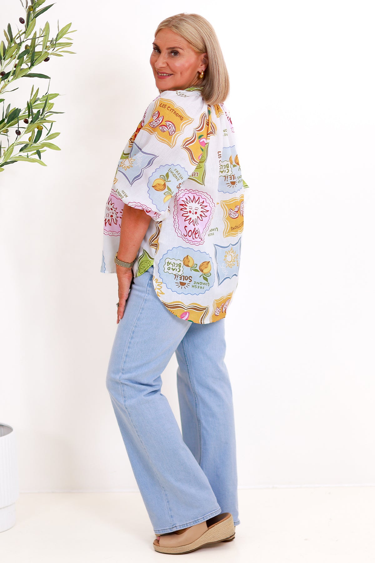 Bright, playful, and effortlessly airy, this shirt is crafted from lightweight fabric and features a white base adorned with sun motifs, citrus illustrations and whimsical label-style graphics.