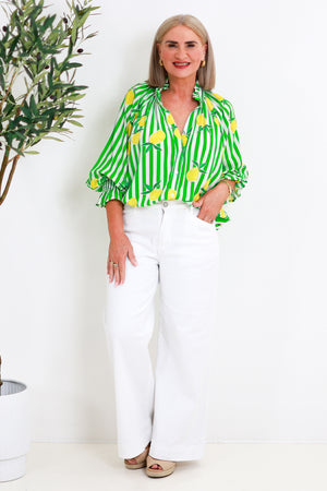 This is an easy fit shirt, which with a vibrant happy print made from breathable natural fibres. This style offers a flattering with the v neck, design and great coverage for the arms.