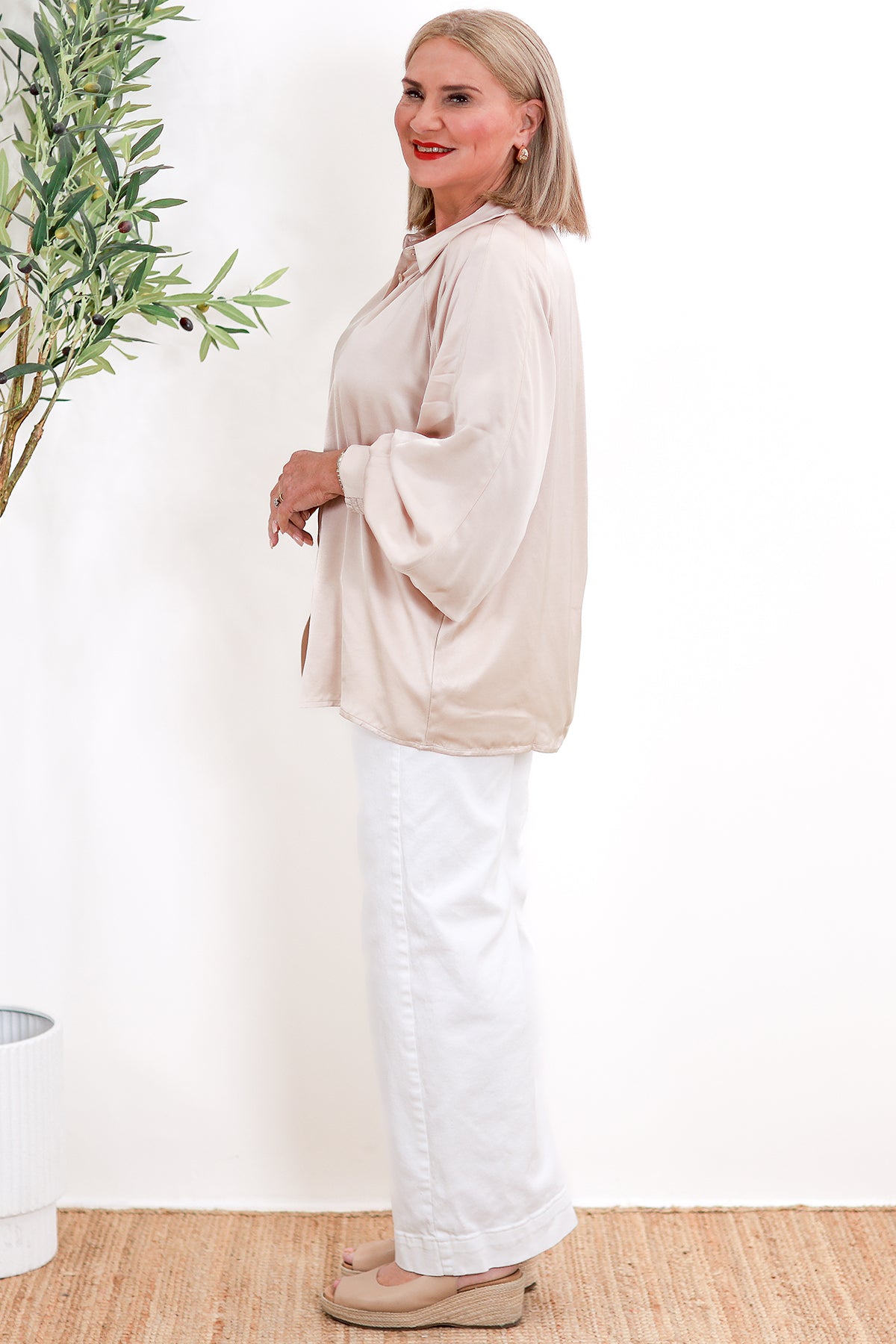 Cut in a softly draping fabric with a silky hand feel, this shirt features a gently oversized fit with fluid lines that flatter every shape. Designed with a relaxed drop shoulder, full sleeves gathered into a deep cuff, and a curved hemline that skims beautifully over the body.