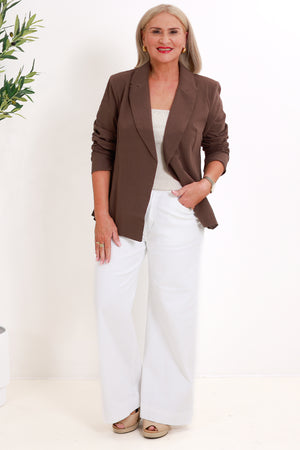 A timeless, easy-wear blazer crafted in a rich chocolate hue. The Roxy Blazer offers a relaxed yet polished fit, bringing effortless sophistication to any outfit. Featuring classic lapels, a single-button closure, and a soft textured feel, this versatile layer pairs beautifully with both casual and workday looks—your go-to piece for elevated everyday style.