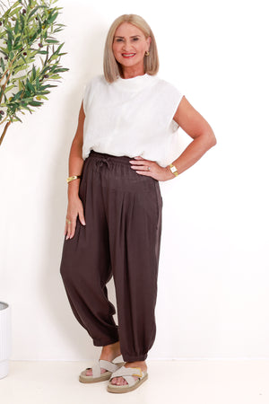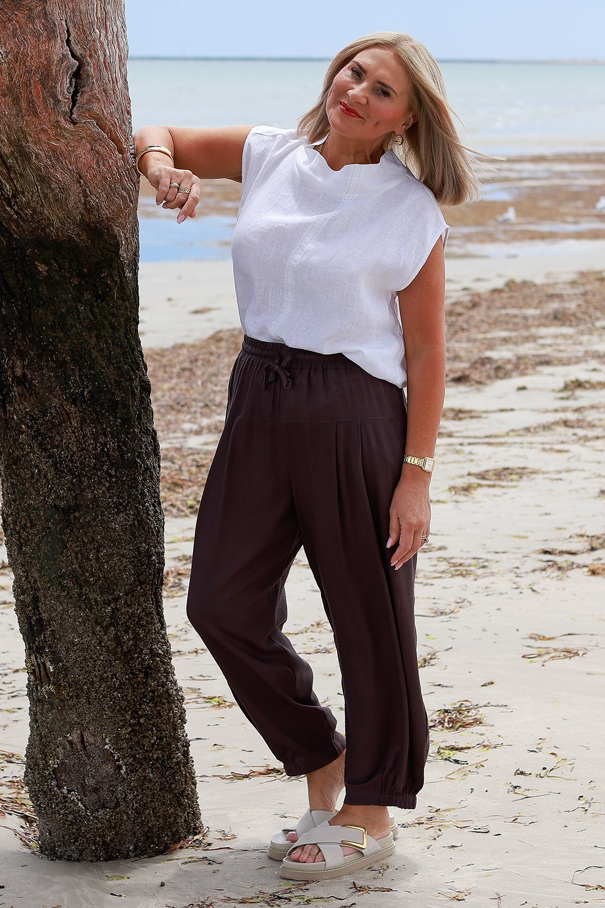 Such sophisticated styling, we love the billowy leg shape that tapers in at the ankle, this design makes styling a breeze as this shape works with so many different shoe styles. Slides, sneakers, ankle boots & mules all work well back with our Kali Pant.