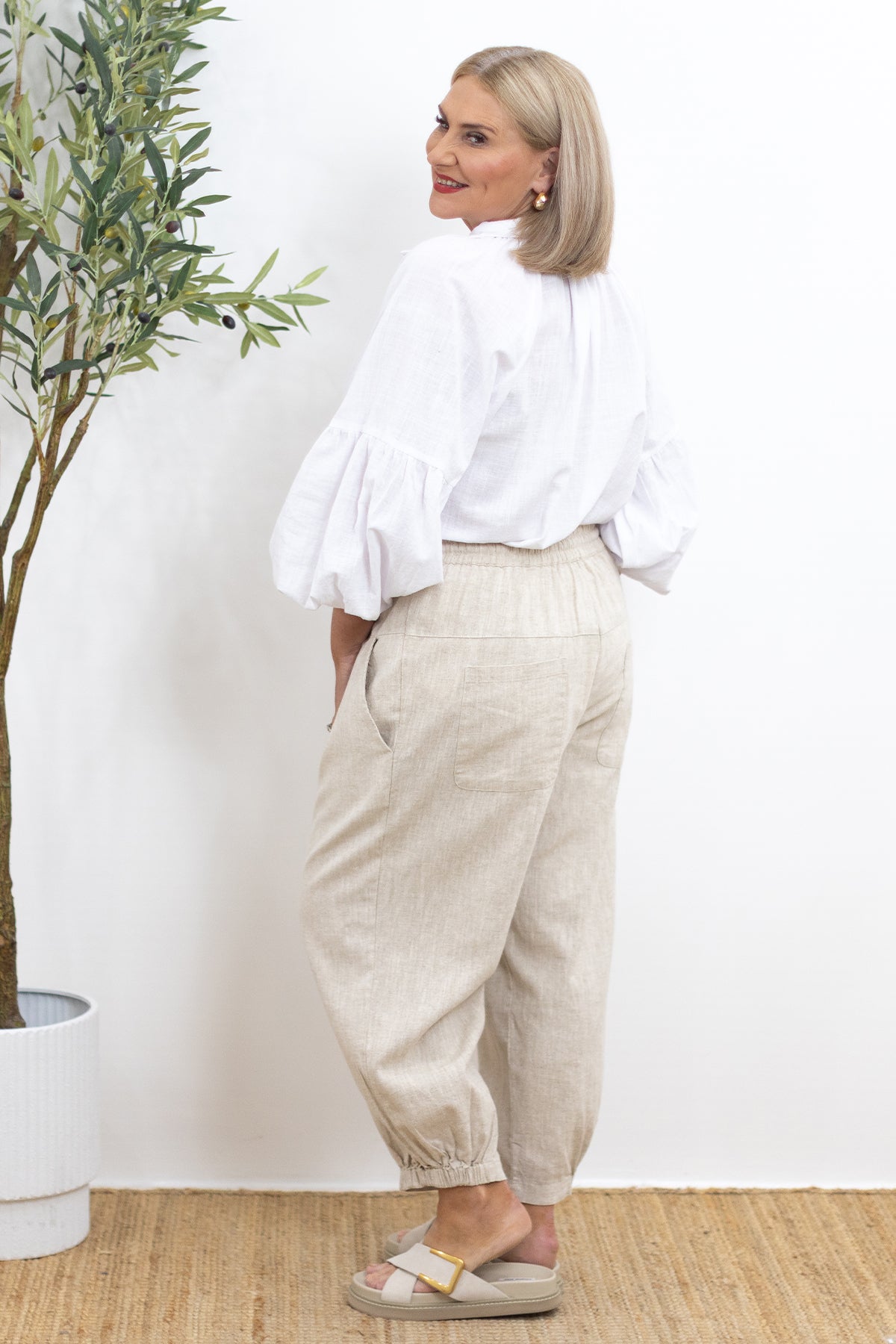 Such sophisticated styling, we love the billowy leg shape that tapers in at the ankle, this design makes styling a breeze as this shape works with so many different shoe styles. Slides, sneakers, ankle boots & mules all work well back with our Kali Pant.